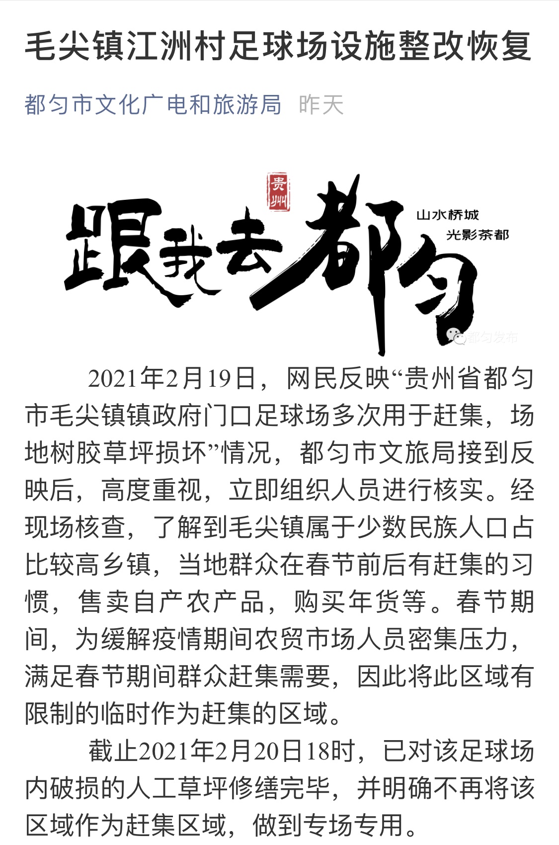 对此,都匀市文体广电和旅游局回应称,为满足春节期间群众赶集需要,因此将此区域有限制地临时作为赶集区域,目前该足球场内破损的人工草坪已修缮完毕,并明确不再将该区域作为赶集区域。