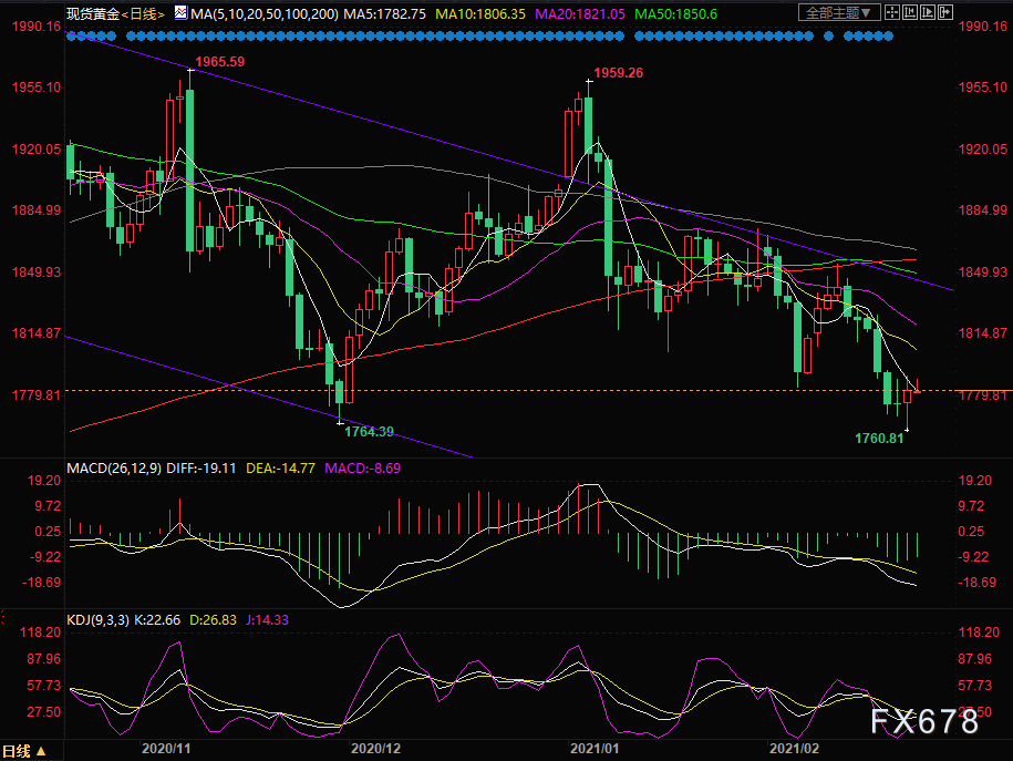 MACD死叉,双线下行,不过绿柱缩短,下跌动能稍稍减弱。金价暂时停止跌势,但多头的反扑软弱无力,未能带动金价大幅上涨,这与此前一波反弹行情形成鲜明对比。可能是金价六连跌极大地打击了多头的信心,令市场多头不敢盲目看涨,而金价跌破前低1764则让投资者意识到了目前金价处在何等的弱势之中。短线金价处在六连跌之后的修正行情中,鉴于目前空头强势,可能反弹力度有限,空头随后或继续控制盘面。建议投资者暂时观望,等待进一步明确的方向信号。中长线走势对金价仍然十分不利。