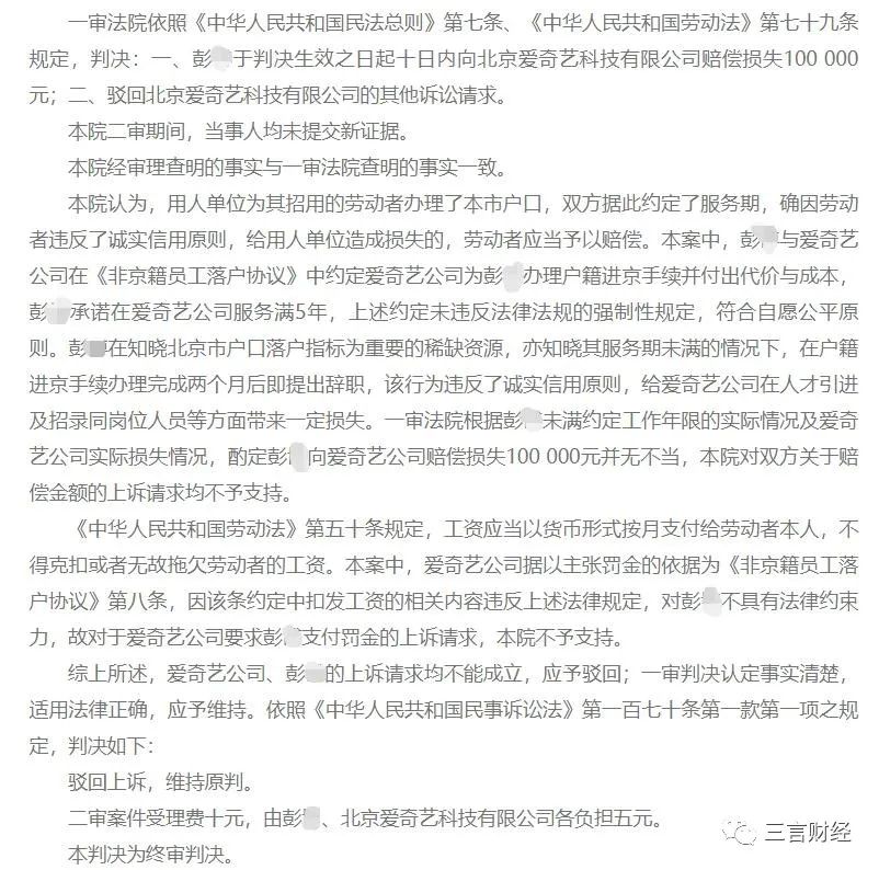原标题:值!爱奇艺员工落户北京2个月后提离职,被判赔10万元