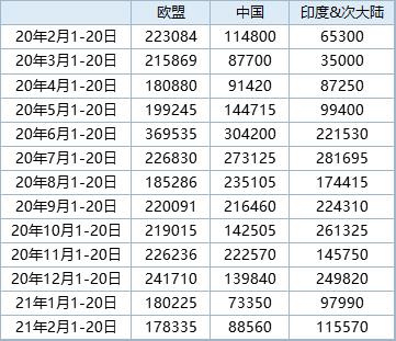 据船运调查机构ITS周一公布的数据显示,2月1-20日马来西亚对印度棕榈油出口量为115570吨,较上月同期的97990吨增长17.94%,增幅较前15日显著收窄;马来对欧盟棕榈油出口量为178335吨,较上月同期下降1.05%,增速由正转负;马来对中国棕榈油出口量为88560吨,较上月同期大增20.74%,增幅亦较前15日收窄。