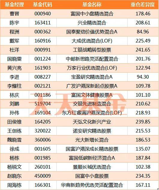以下是他们剔除主题基金后,根据去年四季报总结的重仓差异度前20的基金(指标值越小说明持股越冷门,按基金经理姓名首字母排序),仅供参考: