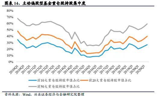 在基金抱团趋势下,去年不少基金的净值乘风而上,也因此吸引了大量资金涌入。据兴业证券,截至去年四季度末,主动偏股型基金前十大重仓股持股市值占全部重仓股持股市值的26.64%,环比提高2.17%;涉及的重仓股占全部上市公司数量的33.16%,环比下降3.09%。