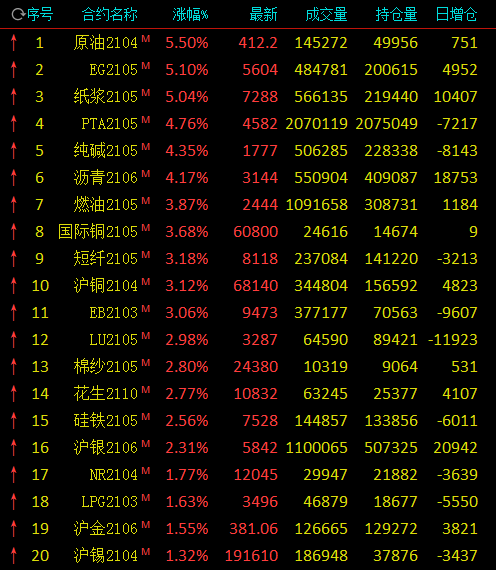 热点栏目2月23日,国内商品期市早盘多数品种上涨,能化品继续强势,原油涨5.5%,纸浆、乙二醇涨逾5%,PTA、纯碱、沥青涨逾4%;双焦延续跌势,焦煤跌3.5%,焦炭跌逾2%;基本金属整体走强,沪铜涨逾3%,国际铜涨3.7%。