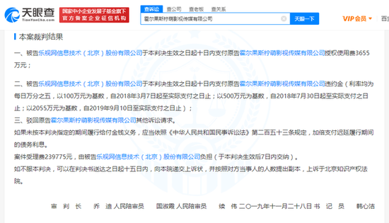 原标题:因著作权许可使用合同纠纷,乐视网被判向柠檬影视支付3655万元