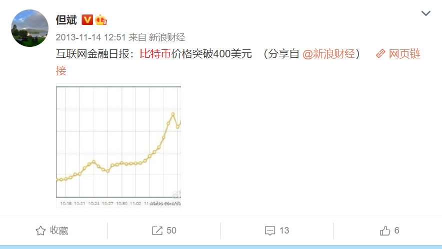 13年11月之后几天,但斌连续发了7条比特币相关微博,内容包括《比特币一年涨了40倍:再现中国大妈身影》等媒体报道。