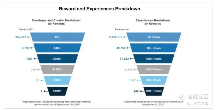 截止到2020年9月30日,过去一年,有超过96万开发者和创造者通过Roblox Platform上赚取游戏代币Robux。其中超过1050名开发者和创造者在平台上赚取10000美元收入,有250名开发者通过Robux赚取10万美元收入。
