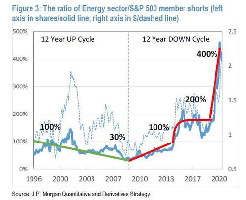 Kolanovic还指出,实际数字可能远不止于此。如下图所示,做空能源股与做空所有其他标普500股票的比例紧紧跟随大宗商品的超级周期。而且,值得注意的是,最近被卖空的能源股票数量平均是标普500股票被卖空数量的4倍。