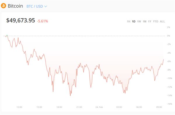 昨日,比特币上演“跳楼”,日内跌幅突破1万美元,最低一度跌至4.5万美元。截稿前,比特币回调到4.9万美元左右水平。
