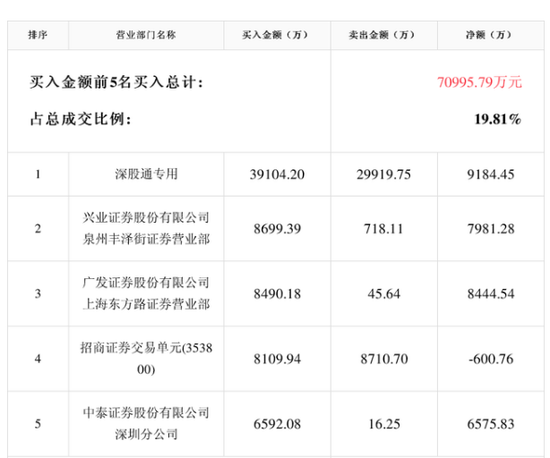 2月23日,盘后龙虎榜显示,买入金额前5名买入总计超7亿元,其中沪深股通专用席位买入资金3.9亿元。