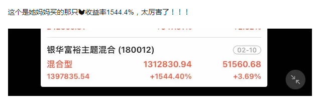 根据网友晒出的账户截图,这只基金是银华富裕主题混合,成立于2006年11月16日,截至今年2月10日,账户收益率1544.40%,大赚131.28万元。