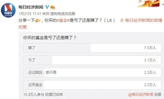 1月底每日经济新闻在微博上发布了一个基金投票。投票话题是:“你买的基金是赚了还是亏了”,有15万人参与。记者由此观察发现,只有不到一半人选择“赚了”,有3.1万人表示自己“亏了”,剩下的参与者分别选择了“还没赎回,都不算”以及“没买基金”。