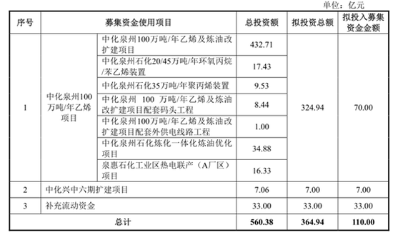 从募投项目来看,项目总投资额560.38亿元,拟投资总额为364.94亿元,其中计划使用募集资金投入110亿元。