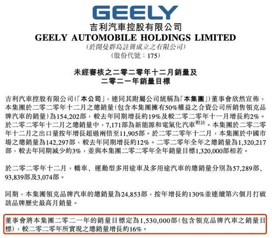 十年间,吉利控股在全球建成五大研发中心和五大造型设计中心,旗下拥有吉利、领克、几何、路特斯等多个汽车品牌;吉利汽车的年度销售量也从2009年的33万辆增加至2020年的132万辆,并将今年的销量目标进一步提升至153万辆。