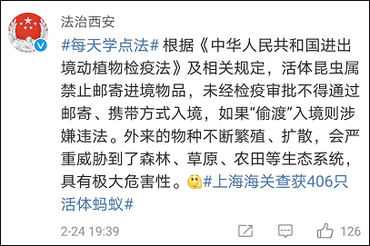 值得一提的是,另据界面新闻24日报道,今年2月,海关总署在内的五部委联合发布《进一步加强外来物种入侵防控工作方案》,要求强化入境货物、快件、邮件等渠道的检疫监管,对截获的外来入侵物种进行严格处置。严厉打击非法引进、携带、邮递、走私外来物种的违法行为,有效堵截外来物种非法入境渠道。