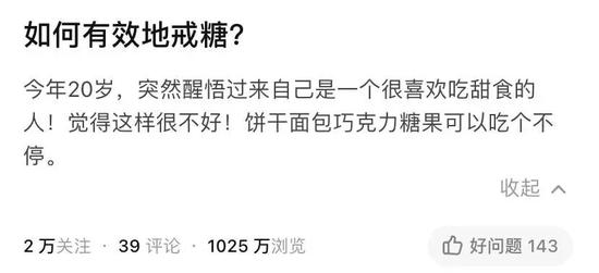 “如何有效戒糖?”成为知乎的热门问答,截止目前,已有1025万浏览量和2万个关注。