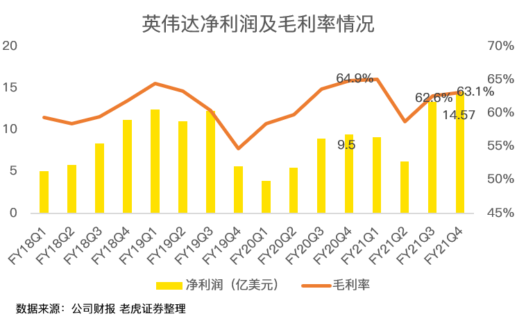 在盈利能力方面,英伟达四季度斩获14.57亿美元净利润,同比大增53%,毛利率为63.1%,低于20财年的64.9%,主要原因是并购mellanox产生一系列费用,加上正在进行Arm的收购,毛利率略有下滑并不足以担忧,且毛利率已经出现环比改善走势。