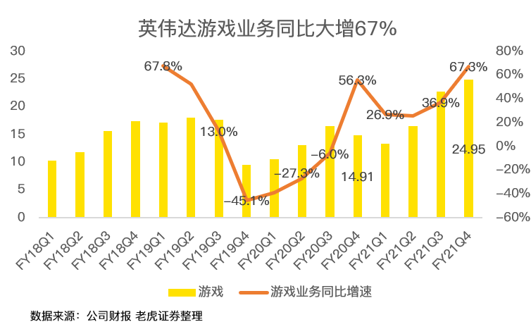 从部门收入来看,游戏业务斩获24.95亿营收,为英伟达第一大营收业务,占总收入的比重接近50%,Q4营收同比大增67%。