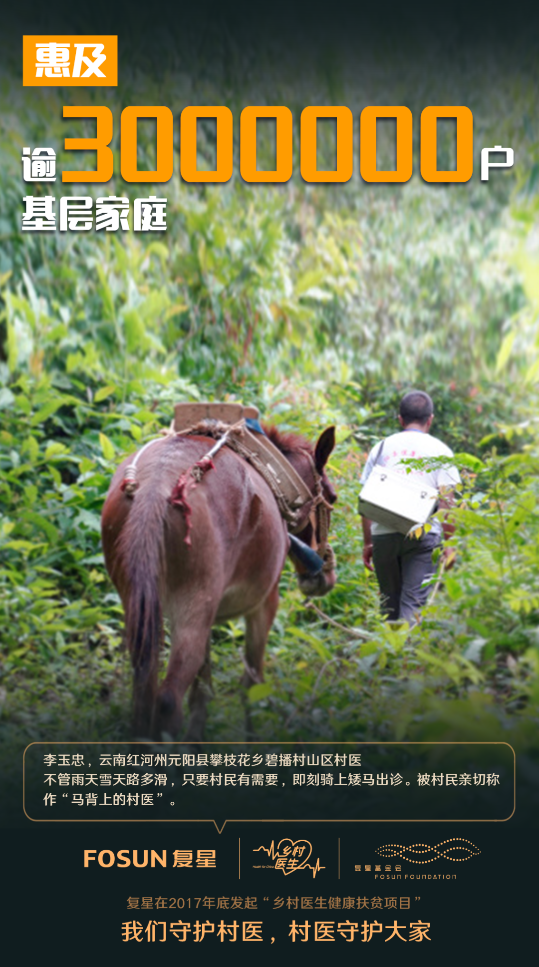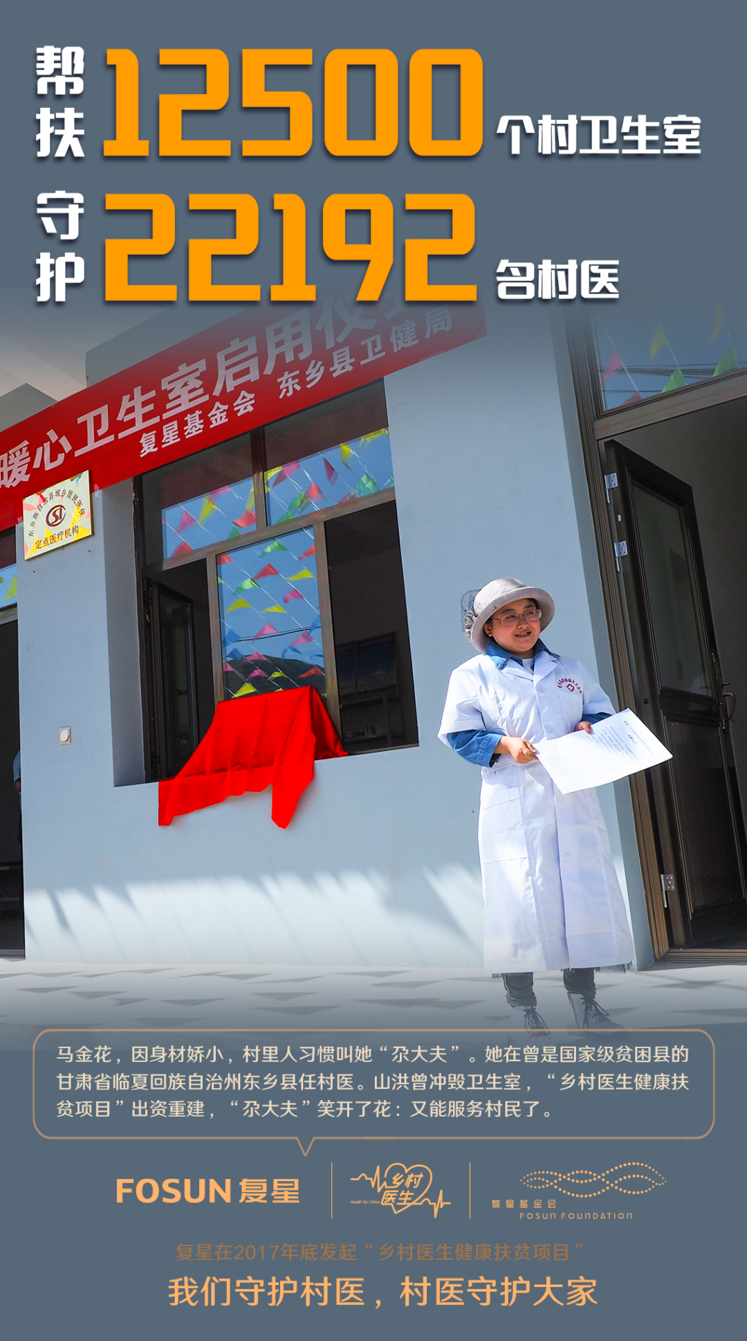 今天,一批又一批志愿者投入了“乡村医生”的一线工作中。我们每年都会从我们复星成员企业中选派优秀员工,从团中央西部计划志愿者中选拔优秀大学生,以专职志愿者的身份赴项目县驻点一年参与一线工作。企业内部充分调动复星全球合伙人的作用,发起“一人一县”结对帮扶,将扶贫落到实处。我们守护村医、村医守护大家,未来,复星会继续努力把“乡村医生”做好做扎实,也欢迎更多力量加入乡村医生守护者,我们一起加油!