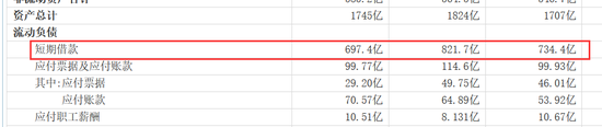 再看一眼短期借款,2019年末高达734亿元,2020年三季度为697.4亿元,这意味着金龙鱼近一年以内债台高筑。
