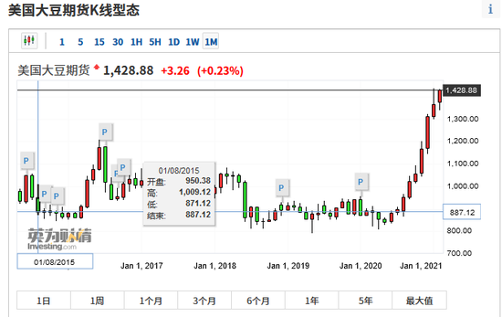该期货合约一路从2020年6月的844美分/蒲式耳,涨到了2021年2月25日的1419.25美分/蒲式耳。8个月内,涨幅高达87%。