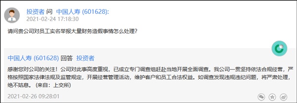 2月26日,有投资者在互动平台上询问中国人寿对该公司员工实名举报大量财务造假事件的处理情况,中国人寿回应称,公司对此事高度重视,已成立专门调查组赶赴当地开展全面调查。公司一贯坚持依法合规经营,严格按照国家法律法规及监管规定,开展经营管理活动,维护客户和员工合法权益。如调查发现违规违纪问题,将严肃处理,绝不姑息。
