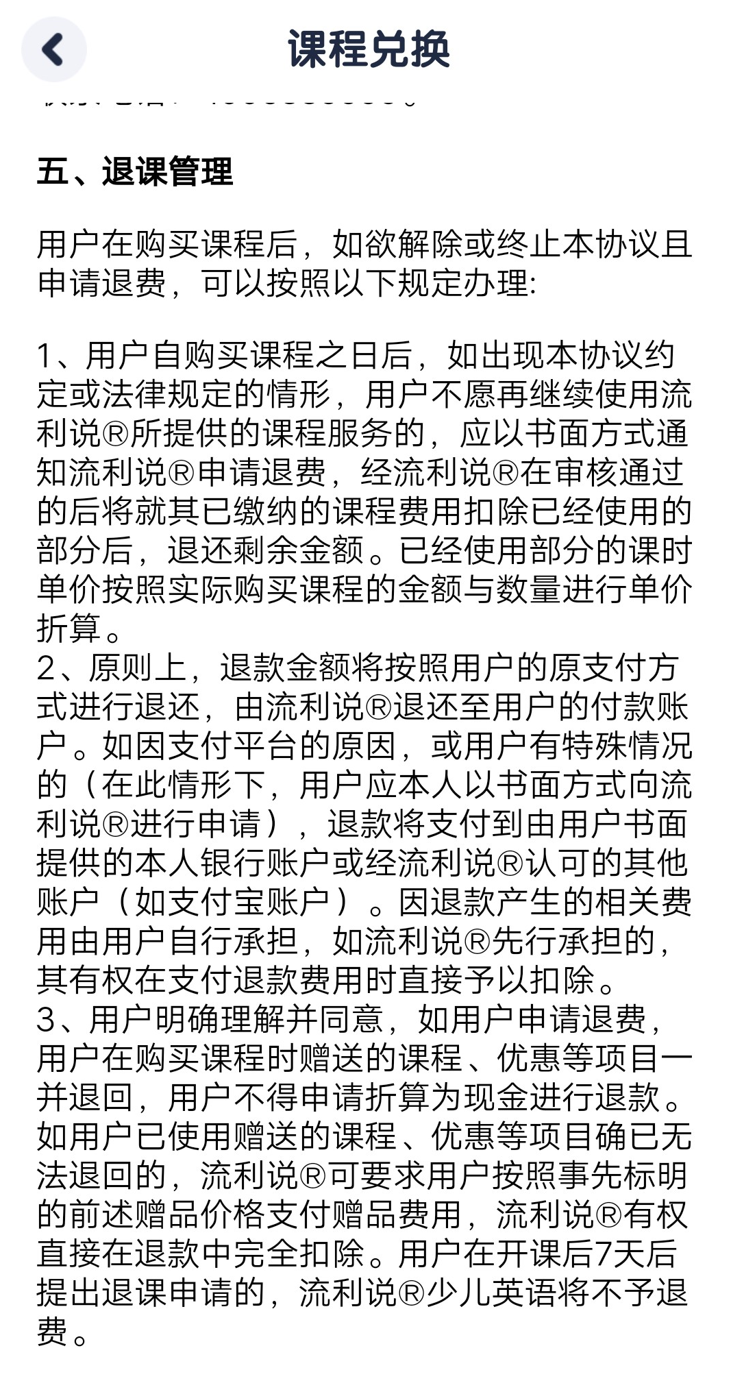对于郭女士的协议中并没有注明退费时应计算教材和礼品的问题,客服表示不清楚,只能以目前的最新协议为准。澎湃新闻记者登录流利说少儿英语客服端后查询到,在最新的《流利说少儿英语课程服务协议》中,确实对“退费管理”一项进行了修改,其中规定用户在申请退费时,用户购买课程时赠送的课程、优惠等项目一并退回,如用户已使用赠送的课程、优惠等项目确已无法退回的,流利说可要求用户按照事先标明的前述赠品价格支付赠品费用,流利说有权直接在退款中完全扣除。