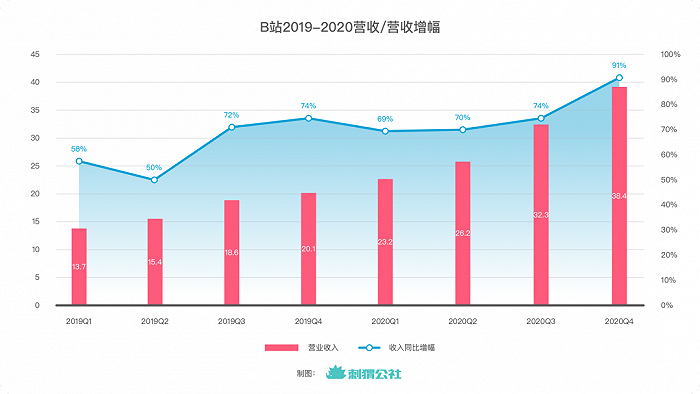 在这样的背景下,B站的快速成长也就有了坚实的内容支撑。而相比2019年的增速,B站在2020年跑得更快了。在2019年,B站的营收同比增速一般在50%-70%左右浮动。2020年,B站每个季度的营收同比增速都达到了接近70%,在2020Q4一度超过了90%。