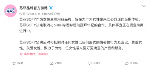 “无职转生”事件还引起了很多女性用户的关注。由于《无职转生》动漫涉嫌对女性的侮辱,很多愤怒的女性用户找到了B站的合作方,要求解除与B站的广告合作。2月中旬,知名女性用品品牌苏菲就紧急终止了与B站拜年纪的合作。