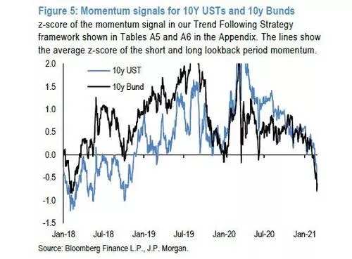 2、CTA和其他动量交易触及超卖水平,短期似乎已经达到了CTAs的均值回归或获利信号。2月25日,10年期美债抛售使得其收益率略高于1.5%,这表明该行的10年期美国美债动量信号达到-1.7标准偏差的极端看跌区域,甚至低于其2018年初的低点-1.5标准偏差。