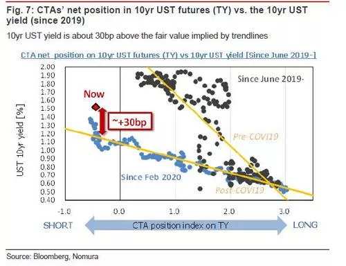 现在每个人都在问的问题是,债券市场什么时候会平稳下来?Nomura 的Takada指出,最坏的时期已经过去,首先,10年期美债可能回落至1.2%-1.3%均值区间,均值回归会促使CTA空头回补获利了结;