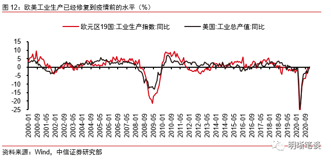 供给端:欧美工业生产基本回到疫情前的水平。除了需求端存在不确定、较难形成全球复苏强共振之外,供给端却存在较强的扩张空间。从美国和欧元区的工业生产角度看,欧美制造业PMI都恢复到疫情前的水平,其工业生产水平也已经修复到疫情前的水平。从中国疫情修复过程中生产端的修复看,预计随着海外疫情的持续改善,海外供给端扩张的弹性较大。