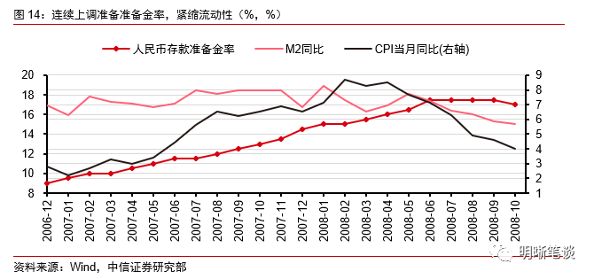 面对通胀压力,中央经济工作会议将2008年宏观政策调控定调“从紧”,防止结构性价格上涨演变为明显通胀。2007年1月至2008年6月,央行连续16次上调人民币存款准备金率,从2007年年初的9.5%提升至2008年6月的17.5%,累计上调幅度达8个百分点,冻结资金巨大;公开市场操作方面,2007年全年共开展正回购操作1.27万亿元,年末余额6200亿元,是年初余额的10.33倍,且2008年上半年正回购操作额度进一步提高至2.35万亿元,同时,为保持基础货币平稳增长和货币市场利率基本稳定,央行年内6次发行定向央票,提高央票发行利率,从量、价上双重出击,控制信贷扩张。多重措施之下,CPI同比增速自08年4月起有所减慢,08年10月CPI同比跌至4%,M2同比也出现下行驱趋势,调控效果明显。