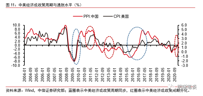 从历史上看,全球持续通胀的前提条件是全球经济的共振修复或者政策的同步扩张。次贷危机之后存在两段全球通胀同步回升的时期:(1)2008年次贷之后,全球货币政策均大幅宽松,全球经济于2008年底、2009年初开始回暖,主要国家和地区的制造业PMI指数彼时也触底回升,虽然中国经济在“四万亿”刺激后稍领先修复,但全球经济整体是共振复苏的,这一阶段全球通胀也快速回升;(2)2015年底2016年初全球经济再次形成共振复苏态势,主要国家和地区PMI指数基本在该期间触底回升,全球经济修复之下通胀也稳步抬升。