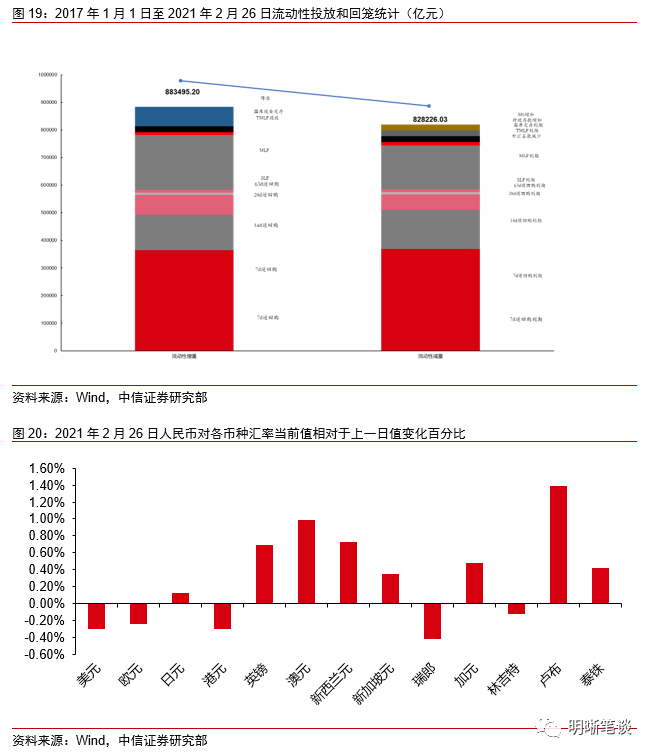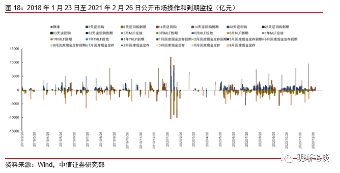 我们对市场流动性情况进行跟踪,观测2017年开年来至今流动性的“投与收”。增量方面,我们根据逆回购、SLF、MLF等央行公开市场操作、国库现金定存等规模计算总投放量;减量方面,我们根据2020年12月对比2016年12月M0累计增加21321.37亿元,外汇占款累计下降8025.20亿元、财政存款累计增加21581.4亿元,粗略估计通过居民取现、外占下降和税收流失的流动性,并考虑公开市场操作到期情况,计算每日流动性减少总量。同时,我们对公开市场操作到期情况进行监控。