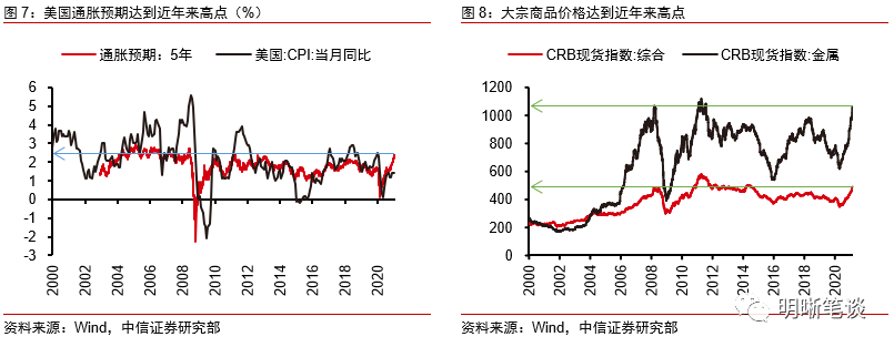 美国国债和大宗商品价格均反映通胀预期走到高位。首先,美国的通胀预期已经回升至近几年高位。美国国债收益率与通胀指数国债(TIPS)收益率的差值代表的通胀预期自2020年3月下旬以来已经大幅上涨,2月份以来5年期通胀预期上升18bps至2.39%,达到2008年次贷危机后最高水平,距次贷危机前的高通胀时期的通胀预期高点也不大。其次,大宗商品市场反映的通胀预期也很高。如前文所述,油价上涨已经接近疫情扩散前的水平,铜价则处于2011年9月以来历史最高位,CRB金属现货指数逐步接近历史最高位。总体而言,美国国债利率和大宗商品价格均反映当前市场通胀预期接近次贷危机后的高点,当前再通胀交易或许已经走到极致。