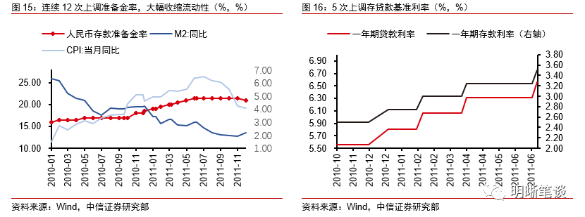 2010年至2011年,央行12次上调存款准备金率、5次加息,并加大公开市场操作力度应对本轮通货膨胀。自2010年初,央行连续十二次上调存款准备率,存款准备金率从2010年年初的16%逐步上调至21.5%的历史最高位,大幅收缩市场上过剩资金;同时,为控制信贷增速,央行分别于2010年10月20日、12月26日、2011年2月9日、2011年4月6日、2011年7月7日共五次上调一年期存贷款基准利率,共计上调1.25个百分点;此外,2010年以来随着公开市场操作的常态化进行,央行积极发行央票,开展正回购操作,加大市场流动性的收回力度。在一系列的“加息提准”的紧缩性货币政策的影响下,M2同比增速于2010年年底出现维稳并逐步开始回落。