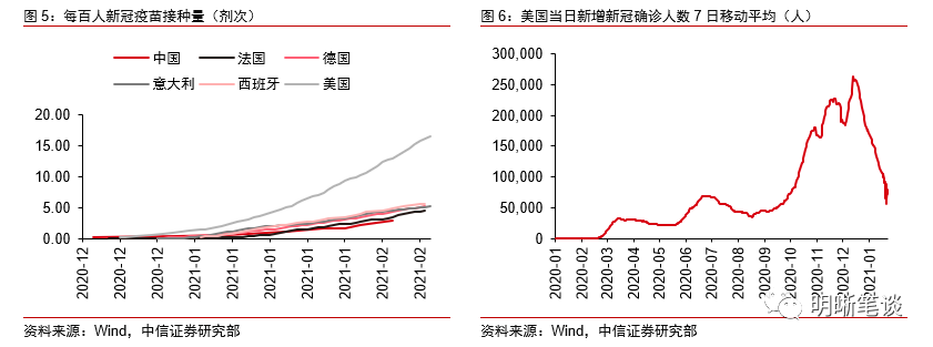 再通胀预期的来源:疫情改善+政策宽松。无论是大宗商品价格上涨还是长期限美债收益率上行,背后都是趋于一致的再通胀预期,主要源于几个方面:首先,近期美国疫苗接种率迅速提升,同时每日新增确诊人数逐步下行,疫情的缓解是经济修复和通胀回升的基础。其次,拜登政府1.9万亿美元的刺激计划进展顺利,美联储也进一步表态会维持宽松的货币政策,流动性宽松进一步推升通胀预期。再次,近期极寒天气对美国原油供给产生冲击,同时经济复苏预期下需求走强带动铜价和油价快速上行。在以上因素的共同作用下,经济和通胀修复预期强化,市场风险偏好提升,再通胀交易走向极致。