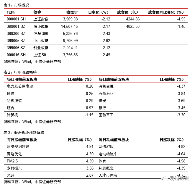 2021年2月26日,银存间质押式回购加权利率大体上行,隔夜、7天、14天、21天和1个月分别变动了41.18bps、0.43bp、-1.07bps、3.16bps和0bp至2.11%、2.21%、2.33%、2.45%和2.51%。国债到期收益率整体上行,1年、3年、5年、10年分别变动0.55bp、2.06bps、1.16bps、0.75bp至2.60%、2.90%、3.11%、3.28%。上证综指下跌2.12%至3509.08点,深证成指下跌2.17%至14507.45点,创业板指下跌2.12%至2914.11点。