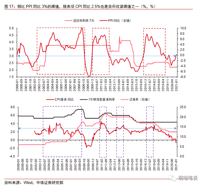 服务项CPI和核心CPI仍下行,货币政策难收紧。从历史上看,PPI同比持续高于3%是央行收紧货币政策的触发阈值之一,但由于历史上并没有出现如此明显的通胀分化情况,因而并不能线性外推本轮PPI同比高于3%后就会导致货币政策的显著收紧。实际上,服务项CPI同比在2.5%附近也是触发货币政策收紧的条件之一,而且次贷危机之后,服务项CPI触发货币政策收紧的准确性更高。目前-0.7%的服务项CPI同比距离触发货币政策收紧的阈值2.5%附近仍然存在较大距离,后续是否会对货币政策形成制约需要观察服务项CPI或核心CPI能否拐头并持续上行。实际上,输入性通胀类似于“非洲猪瘟”导致的“猪通胀”,均是成本推动下的结构性物价上涨,而参考2019年下半年“猪通胀”时期货币政策并没有明显转向,本轮PPI同比在基数效应和输入性通胀下快速回升很难对货币政策产生实质性收紧的影响。