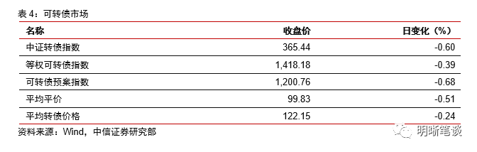 2月26日转债市场,中证转债指数收于365.44点,日下跌0.60%,等权可转债指数收于1,418.18点,日下跌0.39%,可转债预案指数收于1,200.76点,日下跌0.68%;平均平价为99.83元,日下跌0.51%,平均转债价格为122.15元,日下跌0.24%。343支上市交易可转债(辉丰转债除外),除强力转债、德尔转债、鲁泰转债、侨银转债、天壕转债、兴森转债、九州转债、航信转债和迪龙转债横盘外,154支上涨,180支下跌。其中广电转债(21.80%)、鸿达转债(8.25%)和小康转债(7.17%)领涨,金能转债(-9.78%)、赣锋转债(-8.76%)和赣锋转2(-7.10%)领跌。337支可转债正股(*ST辉丰除外),除万顺新材、三超新材、宁波建工、华统股份、宏辉果蔬、重庆建工、久其软件、湖北广电和吉视传媒横盘外,151支上涨,177支下跌。其中鸿达兴业(10.08%)、小康股份(9.22%)和永安行(6.98%)领涨,金禾实业(-9.00%)、新凤鸣(-8.45%)和赣锋锂业(-8.14%)领跌。