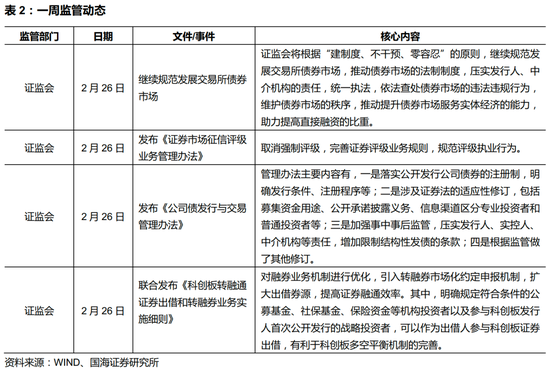 国债收益率短下长上。2 月 26 日,1 年期国债收益率为 2.6036 %,较上周五下行 4.76BP;3 年期国债收益率为 2.9028%,上行 1.06BP;5 年期国债收益率报3.1050 %,上行 2.6BP;7 年期国债收益率报 3.2618 %,上行 3.49BP;10 年期国债收益率报 3.2798%,上行 2.2BP。