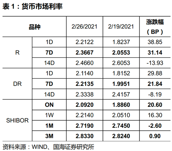 银行间资金利率涨跌不一。2 月 26 日,相较于上周五(2 月 19 日,下同),银行间质押式回购利率方面,R001 上行 38.85BP,R007 上行 31.14BP,R014 下行 13.93BP。存款类质押式回购利率方面,DR001 上行 29.88 BP,DR007 上行 21.84 BP,DR014 下行 8.19 BP。