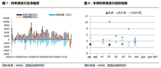 本周利率债净融资额较上周增加。本周一级市场共发行 26 支利率债,实际发行总额为 3,130.50 亿元,较上周增加 2,570.50 亿元;总偿还量为 2,117.40 亿元,较上周减少 2,791.48 亿元;净融资额为 1,013.10 亿元,净融资较上周增加5,361.98 亿元。