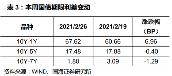 各期限利差涨跌不一。2 月 26 日,与上周五相比,10Y-1Y 利差上行 6.96BP,10Y-5Y 利差下行 0.40BP,10Y-7Y 利差下行 1.29BP。