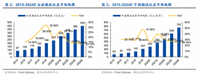 根据Frost & Sullivan报告,2019年全球潮玩市场规模198亿美金,而国内潮玩市场规模自2015年的63亿人民币增长至2019年的207亿人民币,近4年复合增长率34.6%,预计2022年翻倍至478亿,行业快速成长。