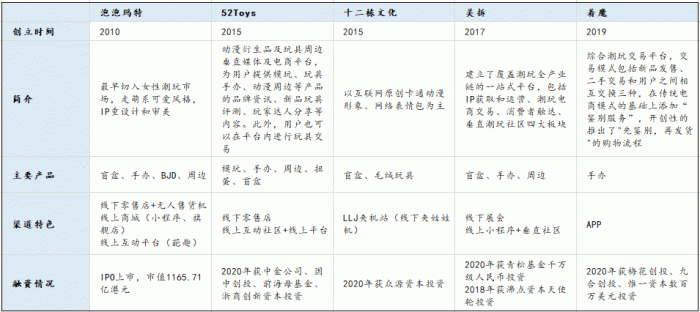 国内潮玩市场主要参与者包括日本的老牌潮玩公司Dreams、Medicom Toy,以及国内新兴潮玩公司泡泡玛特、52Toys、十二栋文化、美拆等,还有更多IP衍生平台、影视衍生品开发的平台参与其中。行业整体除头部外玩家相对分散,国内企业多从某个细分领域切入,进行差异化竞争,并逐渐横向扩张。