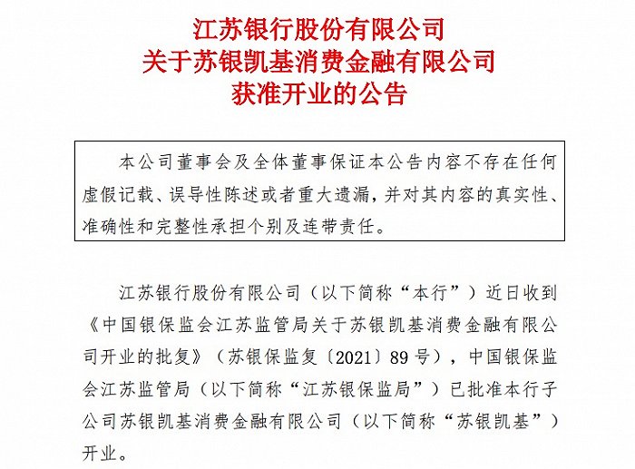 公告指出,下一步,江苏银行将按照监管要求严格履行有关程序,推动苏银凯基消金尽快开业运营。