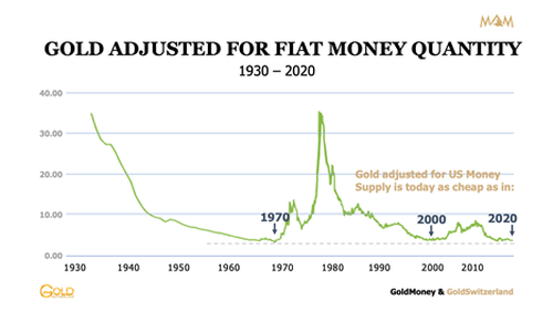 相对于货币供应而言,黄金目前也处于历史低点,与1970年和2000年类似。这意味着黄金价格还远未反映出过去几十年大量货币的创造。