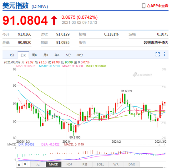 热点栏目3月2日,美元指数站稳91关口,人民币中间价报6.4625,上调129点,上一交易日中间价报6.4754,在岸人民币上一交易日收报6.4615。