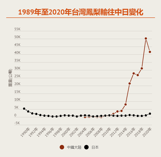 2020年,产销往日本的生鲜凤梨总量为2160吨,也就比大陆地区的零头多一点。